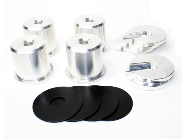 FRS/BRZ solid aluminum subframe bushings replace the stock mushy rubber bushings on your Scion FR-S and Subaru BRZ to eliminate free play of the subframe relative to the chassis. This prevents the subframe from "bouncing around" under drivetrain torque or suspension load, maintaining optimum suspension geometry and reducing wheel hop. Our slide-in shim system allows you to quickly raise or lower the subframe to fine-tune the roll center/anti-squat behavior to your preference. Raising the subframe will compensate roll center for a lowered car at the expense of increasing anti-squat. Lowering the subframe will decrease anti-squat at the expense of roll center. Now Formula Drift Regulation Compliant! With the recent regulation change in Formula D, we changed our kits to comply. You can maintain OEM height and be perfectly legal. Our SPL SOLID series bushings are precision CNC machined from billet 6061 aluminum for an accurate fit. This kit also includes optional rubber isolation washers to reduce noise transfer from the subframe to the chassis. Sold as a complete kit for one car. Made in the USA. Application: 2013+ Scion FR-S/Subaru BRZ/Toyota GT86 Installation Instructions: SPL Solid Subframe Bushings FRS/BRZ/FT86
