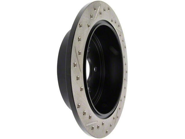 StopTech Drilled and Slotted Sport Rotors are 1-piece direct replacement brake discs for factory brake systems and stock calipers that look great behind your wheels and offer significantly improved braking performance. The unique cross-drilling and slotting aids with heat and brake dust dispersal; prevents glazing of the pads; adds bite and improves wet and dry braking performance. Built to last; the black e-coating provides protection from corrosion and the high carbon metallurgy (in most applications) offers quieter operation; better crack resistance and increased performance.