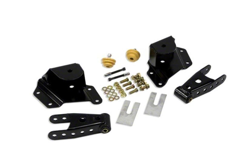 Belltech Shackle and Hanger Kits are designed to lower the rear of your leaf spring equipped Sport Truck or SUV by up to 5" (Note: Application dependent). Belltech's redesigned Shackle and Hangers reposition the front and/or rear leaf spring mounting points (spring eyes) so you can simply and effectively lower your leaf spring equipped Sport Truck or SUV without modifying or changing the factory leaf spring. This allows you to retain OEM ride quality and more importantly factory load capacity.Suspension components are key to making sure your car is riding smoothly on or off the road. With upgraded suspension components, you can unlock the full potential of your vehicles performance.Shackle kits are an affordable way to change the ride height of a vehicle equipped with leaf spring suspension. Shackle lifts are often paired with longer shocks to lift vehicles with solid front axles and leaf springs.Since 1983 small company in Fresno, California had an idea to build the "best performing" lowering suspensions for the Chevrolet pickup. Fresno had been a haven for lowered vehicles and trucks were in abundance. Trucks were being lowered but their suspensions were terrible and not very roadworthy. Springs were either replaced with new ones not necessarily meant for the application and even worse they may be cut or heated with a torch at the local muffler shop to give the lowered stance that was cool. The stance looked good but the ride was terrible.