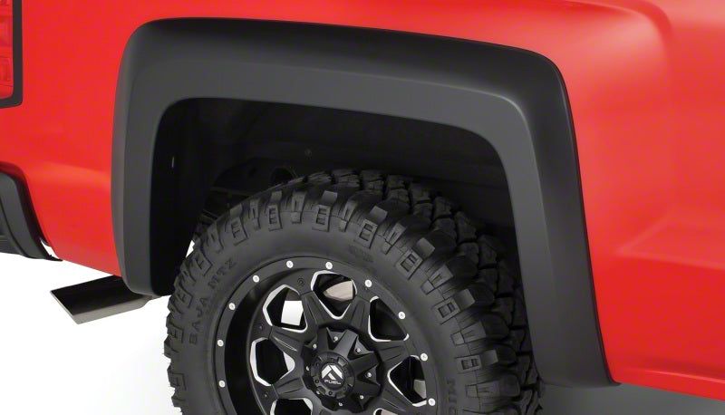 You've equipped your vehicle with oversize wheels and tires for serious off-road traction and clearance. Now you need extra tire coverage to protect your rig's body and maybe even comply with local laws. Bushwacker Extend-A-Fender Flares deliver premium-grade protection and style matched to oversized tires, yet as tough as they are, they go on easily with no drilling required. You can install them in minutes and enjoy them for years. Our exclusive Dura-Flex 2000 material is designed for added durability and flexibility with built-in UV protection. Your Extend-A-Fender Flares resist chalking, cracking, and warping, whether you leave them with their OEM-style matte black finish or paint them for a totally personalized look. Either way, your truck will look factory-equipped for your off-road tires. Extend-A-Fender Flares go on easy, perform tough, and look great.