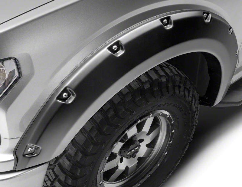 With their recessed stainless steel bolts and massive presence, Pocket Style Fender Flares are a Bushwacker original and an off-road icon. They give you the hard-core look of bolt-on flares, with no body-side sheet metal drilling required. Pocket Style Fender Flares are custom-designed for your vehicle to complement oversized tires and high-clearance lift kits. You can mount them right out of the box with their tough, OEM-style matte black finish they're UV protected so they won't chalk. You can also paint them to match or accent the body color for a factory-custom look. Pocket Style Fender Flares are made from our thick, warp-resistant Dura-Flex 2000 material and tailor-made for added durability and flexibility on the trail. When you need maximum tire coverage with minimum time and effort, it's in the pocket. Pocket Style Fender Flares from Bushwacker.