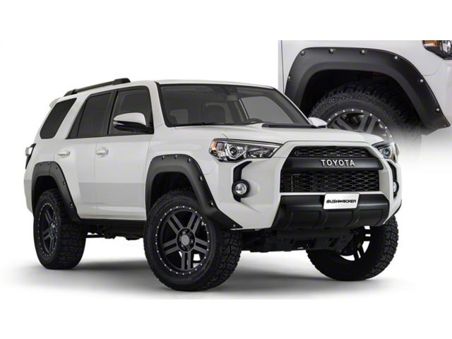 With their recessed stainless steel bolts and massive presence, Pocket Style Fender Flares are a Bushwacker original and an off-road icon. They give you the hard-core look of bolt-on flares, with no body-side sheet metal drilling required. Pocket Style Fender Flares are custom-designed for your vehicle to complement oversized tires and high-clearance lift kits. You can mount them right out of the box with their tough, OEM-style matte black finish they're UV protected so they won't chalk. You can also paint them to match or accent the body color for a factory-custom look. Pocket Style Fender Flares are made from our thick, warp-resistant Dura-Flex 2000 material and tailor-made for added durability and flexibility on the trail. When you need maximum tire coverage with minimum time and effort, it's in the pocket. Pocket Style Fender Flares from Bushwacker.