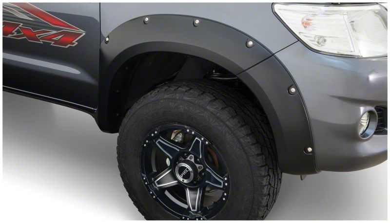 With their recessed stainless steel bolts and massive presence, Pocket Style Fender Flares are a Bushwacker original and an off-road icon. They give you the hard-core look of bolt-on flares, with no body-side sheet metal drilling required. Pocket Style Fender Flares are custom-designed for your vehicle to complement oversized tires and high-clearance lift kits. You can mount them right out of the box with their tough, OEM-style matte black finish they're UV protected so they won't chalk. You can also paint them to match or accent the body color for a factory-custom look. Pocket Style Fender Flares are made from our thick, warp-resistant Dura-Flex 2000 material and tailor-made for added durability and flexibility on the trail. When you need maximum tire coverage with minimum time and effort, it's in the pocket. Pocket Style Fender Flares from Bushwacker.