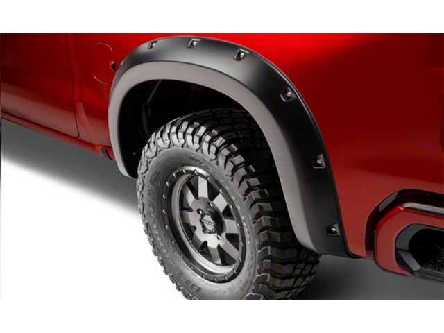 With their recessed stainless steel bolts and massive presence, Pocket Style Fender Flares are a Bushwacker original and an off-road icon. They give you the hard-core look of bolt-on flares, with no body-side sheet metal drilling required. Pocket Style Fender Flares are custom-designed for your vehicle to complement oversized tires and high-clearance lift kits. You can mount them right out of the box with their tough, OEM-style matte black finish they're UV protected so they won't chalk. You can also paint them to match or accent the body color for a factory-custom look. Pocket Style Fender Flares are made from our thick, warp-resistant Dura-Flex 2000 material and tailor-made for added durability and flexibility on the trail. When you need maximum tire coverage with minimum time and effort, it's in the pocket. Pocket Style Fender Flares from Bushwacker.