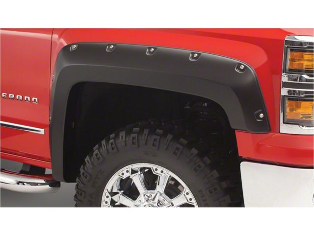 With their recessed stainless steel bolts and massive presence, Pocket Style Fender Flares are a Bushwacker original and an off-road icon. They give you the hard-core look of bolt-on flares, with no body-side sheet metal drilling required. Pocket Style Fender Flares are custom-designed for your vehicle to complement oversized tires and high-clearance lift kits. You can mount them right out of the box with their tough, OEM-style matte black finish they're UV protected so they won't chalk. You can also paint them to match or accent the body color for a factory-custom look. Pocket Style Fender Flares are made from our thick, warp-resistant Dura-Flex 2000 material and tailor-made for added durability and flexibility on the trail. When you need maximum tire coverage with minimum time and effort, it's in the pocket. Pocket Style Fender Flares from Bushwacker.