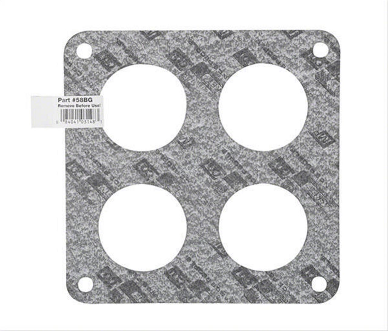 Throttle Bores. 4-hole gasket design. Gasket thickness .058in. Bulk packaged, can be purchased individually or master-pack of 10 pcs. Made from cellulose/nitrile composition gasket material. Provides excellent sealing and durability for all fuel (alcohol and gasoline) applications. Precision die-cut for excellent fit and seal. Seals using low flange pressure (clamp force), conforms to and seals any imperfections on sealing surfaces. Releases easily (no gasket scrapping required), will not stick to carburetor base or intake manifold mating surfaces.