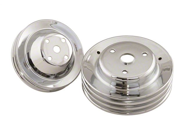These new pulley sets are designed as matched sets to assure correct alignment of the drive belts. They are highly polished then chrome plated for lasting beauty. They are available in single, double and triple groove sets. Fits Chevy small block, 55-68 with short water pump, double upper and lower.