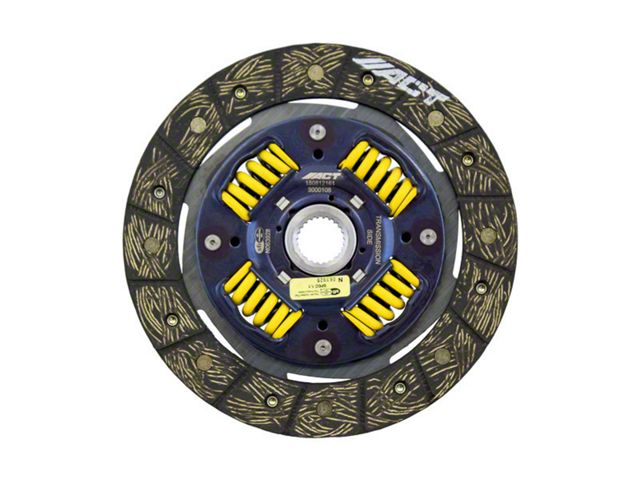 3000108 is a performance street disc and the most popular disc purchased. It features premium organic materials with high copper content for better heat transfer. Performance street discs allow for quicker shifting and smooth engagement. These discs feature a reduced marcel for faster shift action to complement ACT pressure plates. ACT spring-centered assemblies use bushings and cone springs similar to factory clutch discs. This creates frictional dampening, which improves clutch life and reduces noise. Quiet operation with increased strength and reliability.