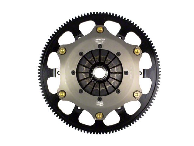 T1RR-H04 race, twin disc kits are race-ready for the serious enthusiast who needs a direct bolt-in kit, requiring no additional modifications. ACT's sintered iron race discs offer the highest torque capacity of all ACT race discs and have ultra-high heat capacity. Most kits offer pedal loads 10-20% higher than stock, yet increasing the clamp load by 80-90%. All ACT twin disc kits include a CNC-machined and dynamically balanced flywheel for trouble free use. All kits undergo an exclusive four-stage, heat-treating process on all diaphragms. ACT twin disc kits include a pressure plate, two discs, floater, flywheel and alignment tool. Some kits may include a pilot bearing and release bearing. ACT Twin disc kits meet SFI Specification 1.2.