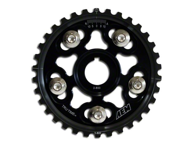 AEM Tru-Time Adjustable Camshaft Gears increase horsepower and torque without having to change the camshaft(s) and are must-have items for engines that are milled, forced induction, high compression and/or utilizing aftermarket competition cams. AEM Tru-Time cam gears enable users to match cam timing with their vehicle's tuning state by advancing or retarding the cam profile(s) in one-degree increments via true laser-etched markings. Precision-cut gear teeth ensure no premature wearing of the cam gear's belt surface and AEM's anodizing on the adjustable cam gear's teeth is lab-test proven as the hardest anodizing process on the market.
