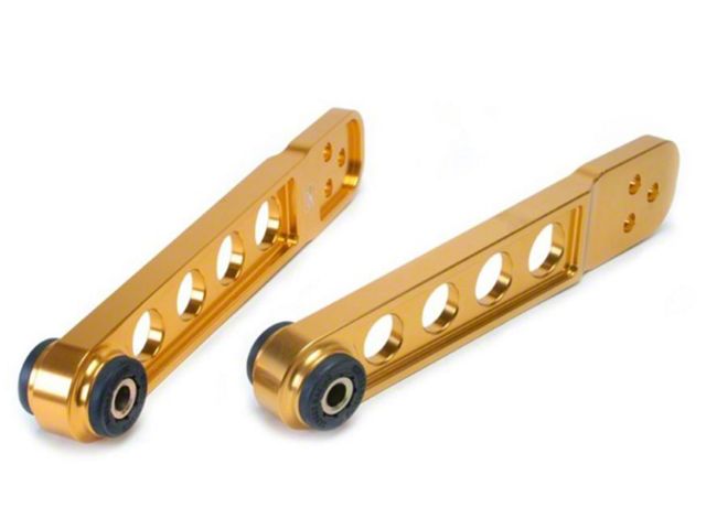 Skunk2's Gold Anodized Rear Lower Control Arms for the '01-'05 Civic are based off of the same technology the company's been using on its own race cars for more than a decade and are a must-have for enthusiasts looking to fine-tune their suspension for maximum handling performance. Skunk2's Rear Lower Control Arms are direct replacements, maintain OEM suspension geometry, and are ideal for street and race applications. Each arm is forged from aircraft-quality 2024 billet aluminum, precision CNC-machined, and is more than 25 percent lighter than the OEM arms. Skunk2 Rear Lower Control Arms also feature adjustable anti-sway bar mounting holes for advanced suspension tuning and optimum balance. The low-deflection, polyurethane bushings act as bearings for quicker response and a more positive feel. Skunk2 also eliminated tearing and un-seating problems typically associated with other fixed rubber bushings by allowing the arm to rotate freely about the bushings. Properly designed suspension components must be strong and functional first and aesthetically pleasing second. Skunk2's Rear Lower Control Arms are both. Each arm's I-beam shape and tapered design is a direct result of efforts to eliminate twisting, bending, and stress risers. Extensive FEA (finite element analysis) testing determined that conventional 'straight and flat' designs are plagued by internal stress risers. A poorly designed arm will concentrate stress in particular zones, causing the arm to fracture and ultimately fail. For maximum suspension performance, Skunk2 Rear Lower Control Arms are best complemented with Skunk2 Rear Camber Kits, Lower Arm Bars, and Strut Tower Bars.