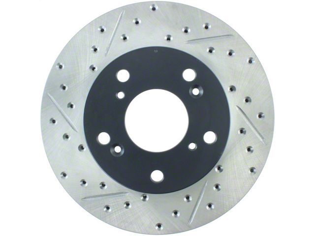 StopTech Drilled and Slotted Sport Rotors are 1-piece direct replacement brake discs for factory brake systems and stock calipers that look great behind your wheels and offer significantly improved braking performance. The unique cross-drilling and slotting aids with heat and brake dust dispersal; prevents glazing of the pads; adds bite and improves wet and dry braking performance. Built to last; the black e-coating provides protection from corrosion and the high carbon metallurgy (in most applications) offers quieter operation; better crack resistance and increased performance.