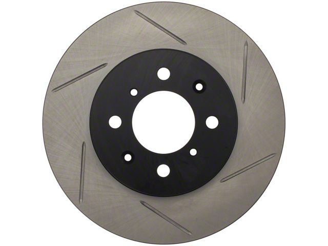 StopTech Slotted Sport Rotors are 1-piece direct replacement brake discs for factory brake systems and stock calipers that look great behind your wheels and offer significantly improved braking performance. The unique slotting aids with heat and brake dust dispersal; prevents glazing of the pads; adds bite and improves wet and dry braking performance. Built to last; the black e-coating provides protection from corrosion and the high carbon metallurgy (in most applications) offers quieter operation; better crack resistance and increased performance.