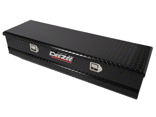 Dee Zee Tool Box - Red Label Chest. Constructed of heavy duty Brite-Tread aluminum. Black-Tread powder coat, provides a gloss black finish while it protects and prevents oxidation. Crown style lid with a full pan double-V stiffener for superior rigidity. Slanted front design to clear wheel well impact. Other features: lockable stainless steel paddle handles, dampened gas shocks, closed cell foam gasket, and self-adjusting strikers. Removable plastic tool tray to help keep small items organized.