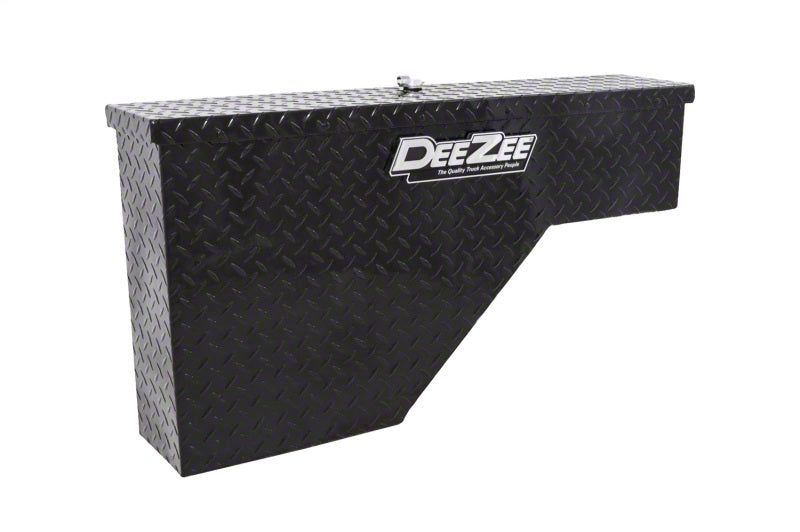Dee Zee Tool Box - Wheel Well Box. Adds storage while leaving your bed open for hauling cargo. Constructed of strong Brite-Tread aluminum. Black powder coat finish. Lockable lift-up lid on a sturdy piano hinge. Fits 6 and 8 bed pickups. Driver side mounting