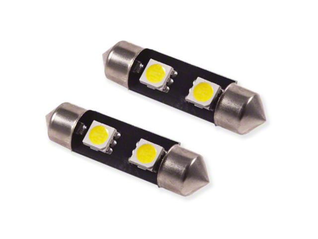 Features Direct replacement for factory 36mm festoon bulb Adds more modern LED appearance Plug and play simple installation Overview Design. The 36mm SMF2 LED bulb is a direct replacement for any 36mm-size bulb commonly found in vanity mirror lights in many vehicles. Populated with two 5050-size SMDs the SMF2 upgrades the factory yellowish incandescent bulb to a more modern LED appearance while adding far more total light output than the factory bulb. The SMF2 was designed with an embedded load resistor and implanted diode for superior reliability. With its durable metal terminals it will fit snugly in the socket and its light weight means it won't vibrate loose over time. Reliability. Unlike other bulbs on the market this bulb is built with constant-current circuitry along with transient suppression. That means this bulb will last for years not months with no flickering or failure. And like every Diode Dynamics product it's backed by an industry-leading three-year replacement warranty. Brightness. With 24 lumens of true measured output the SMF2 LED will provide about double the total light compared to your original 36mm-sized bulb. All Diode Dynamics LED lighting is rated with accurate measured lumen figures not calculations or guesses. We test the true output in-house and provide you the real numbers to compare. Colors. In addition to vibrant colors of blue red amber and green the SMF2 is available in a cool white 6000K and warm white 3000K option as well. Whether you want a modern cool white appearance or a traditional warm white color we have the color to fit your need!