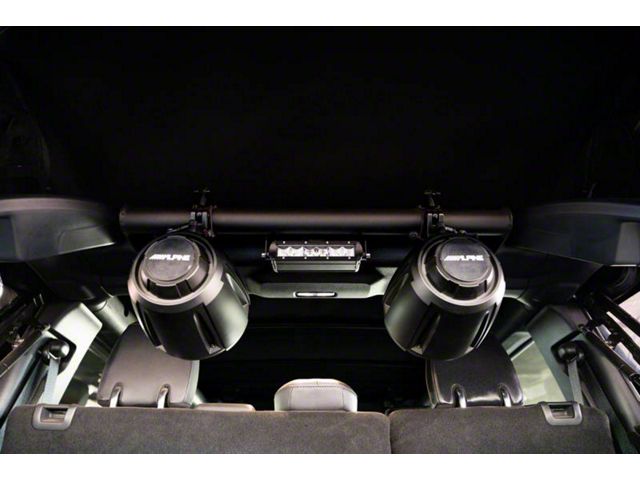 This crossbar was designed to provide your Bronco additional mounting options for rear facing LED lights and speaker cans, or a speaker bar. The bar measures 29-inches in total length, and is 2-inches in diameter. There is a 10-inch slotted flat mount in the middle of the bar. 4 holes, 2 towards each end, allow you to run wiring hidden inside the bar. It is finished in a Micro-Texture Black Powder Coat, which blends well with the OEM trim. There are several possible configurations you can run. Two speaker cans with roll bar clamps can be installed, with up to a 6-inch light bar or two 3-inch pod lights on the flat mount. You can run a 20-inch light bar across the length of the bottom if utilizing the back rail mounts on the bar. Alternatively, a speaker bar up to 28-inches wide with roll bar clamps can be mounted across the bottom of the bar.