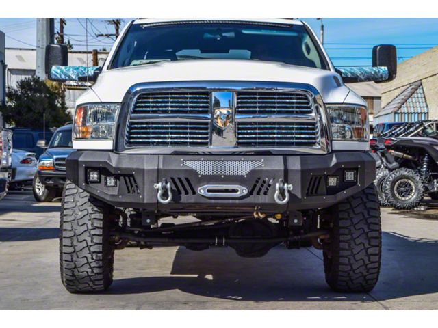 FBDR2-04 2010-2018 RAM 2500 Front Bumper. The DV8 Offroad FBDR2-04 front bumper is designed to provide exceptional protection at a fraction of the weight of ordinary steel bumpers. Although these bumpers are made with 3/16 inch steel and 1/4 inch reinforcements throughout, DV8 shaves every pound possible off the bumper with strategic cutouts and mesh aluminum grills that can be removed and color matched to the vehicle. DV8 also integrates 4 LED light holes into the bumper for improved visibility. This bumper has 2 shackle recovery points and is designed to accommodate up to a 16,000 lbs. winch. The 3 piece design allows for easy replacement if one of the pieces is damaged in an accident and also provides the opportunity to swap out the end pieces for a different style i.e. Baja, plate, high clearance etc. DV8 Offroad did not sacrifice style or functionality when making these bumpers modular. Every bumper uses razor thin adjoining edges to keep the full-size bumper look and brackets that extend from the bumper ends to the frame where necessary to provide excellent strength and rigidity. This bumper comes powder coated in a sand texture black finish. This finish can be left as is or can be sanded down and painted over to color match the bumper to the vehicle. Key Features: Lighter than ordinary steel bumpers, Every bit as rigid as a one piece bumper, Cut outs for 4 LED Pod Lights (DV8 p/n B3CE16W4W), Accommodates up to 16,000 lbs. winch, 2 Shackle recovery points, Modular design allows for customization, Sand texture powder coat finish, Mesh inserts can be color keyed to vehicle, Lights Not Included.