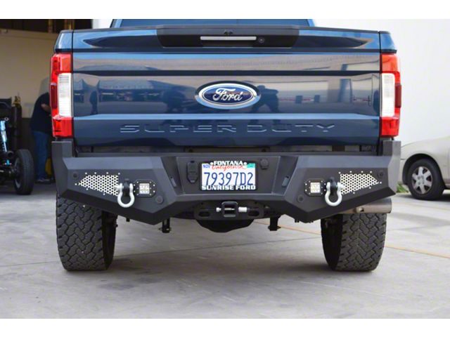 RBFF2-02 2017 to present Ford F-250/350/450 Rear Bumper. The DV8 Offroad RBFF1-02 rear bumper is designed to provide exceptional protection at a fraction of the weight of ordinary steel bumpers. Although these bumpers are made with 3/16 Inc. steel with 1/4 inch reinforcements throughout, DV8 shaves every pound possible off of the bumper with strategic cutouts and mesh aluminum grills that can be removed and color keyed to the vehicle. DV8 also integrates 2 LED backup lights into the bumper for improved visibility while backing up. This bumper has 2 shackle recovery points and utilizes the factory license plate lights and comes in a lightly textured black powder coat. Key Features: Lighter than normal steel bumpers, Mesh aluminum grills that can be color keyed to the vehicle, LED backup lights, Utilizes the factory license plate lights, Retains access to spare tire, Comes powdercoated, Lights Included.