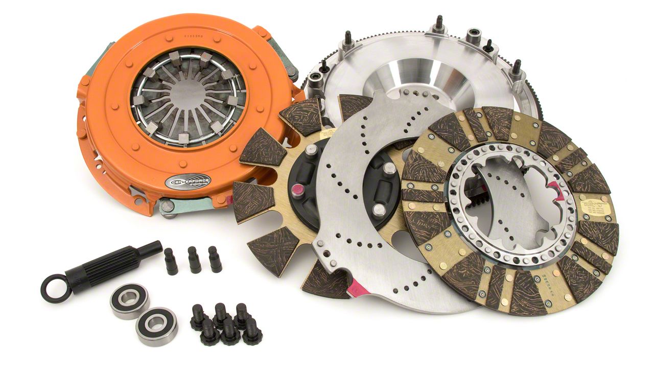 The Centerforce DYAD DS 10.4" twin disc clutch has been developed for vehicles requiring a holding capacity of 500 to 1300 ft/lbs of torque at the crank. The pressure plate features our patented centrifugal weight system for superior clamp load over stock and our patented ball bearing actuated pressure plate providing light pedal effort. The discs are equipped with organic segmented facings providing increased holding capacity and the sprung/dampened drive disc provides smooth drivability. DYAD DS clutches are equipped with a lightened billet steel flywheel providing low inertia resulting in quicker RPM's. Components are designed, machined and assembled in the USA. DYAD DS clutches are match balanced and ready for installation using the included ARP fasteners.