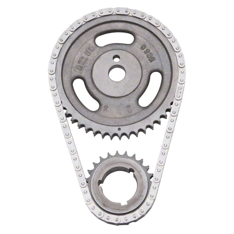Edelbrock part #7813 Performer-Link timing chain is for use with Edelbrock or stock cams. They have a solid-bushing chain for a true bearing surface that rolls with the sprockets, eliminating chain stretch. Cam sprockets are made from 35,000 psi tensile strength cast iron. Crank sprockets are made from billet SAE-1144 steel and induction heat treated. Four Performer-Link sets are stock replacement parts and 50-state legal (see listings in bold type). All other sets have three keyway setting points to ensure accurate timing selection for early or late-model vehicles. Performer-Link timing sets are not for use above 6500 rpm- ? Performer roller chain sets are engineered to operate up to 6500 rpm.- ? Never hammer directly on chain or sprockets. You can crack the hardened links and pins and cause early failures. - ? Use a sleeve for installations that require hammering, a brass drift punch may be used if you carefully alternate blows on either side of the sprocket to avoid cocking. - ? Never stretch the chain with a screwdriver. - ? Check for clearance between the timing chain and block and between the chain and front cover before reassembly. - ? Be sure that both cam and crank sprockets are exactly in line with each other. Misalignment can cause chain to break