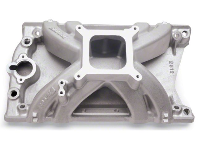 Edelbrock part #2812 Victor Oldsmobile intake manifold provides power levels never before available for competition single-carb 350-403 Olds engines. Featuring a single-plane "Air-Gap" design, it accepts square-bore carb and offers significant horsepower increases over existing intakes in the 4500 to 7500 rpm range. It features a carb mount pad height of 7" and high-flow constant area 3.2-square-inch runners. The runners have been optimized to match the flow characteristics of Edelbrock Performer RPM aluminum cylinder heads #60519 and the exit size, as-cast, is 1.28" by 1.94" with plenty of metal thickness for gasket matching and porting.