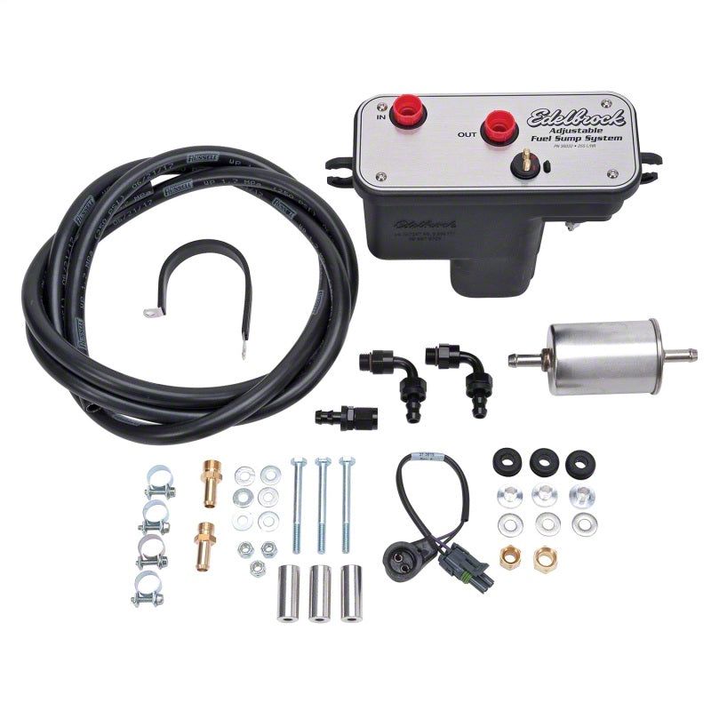 The Universal Fuel Sump Kit #36031 includes everything needed for a complete installation and is designed to provide the necessary high fuel pressure required for EFI applications in vehicles equipped with an existing low-pressure carbureted fuel system. This Universal Fuel Sump is a self-contained high-pressure fuel pump/sump unit that can be easily installed under the hood. The unique design of the Edelbrock Fuel Sump allows it to deliver constant fuel pressure with no fuel return line, external fuel pressure regulator or fuel tank modifications. The Edelbrock Universal Fuel Sump is compatible with the existing factory fuel tank and pump and is ideal for use with aftermarket EFI systems as well as many popular engine swap applications that require constant 35-90 PSI fuel pressure. This Universal Fuel Sump features a compact design that is adjustable from 35 to 90 PSI and includes a vacuum reference port. A flow rate of 67 GPH can support up to 600 HP and is a perfect choice to use with Pro-Flo 3, Pro-Flo 4 or other aftermarket EFI systems. Part #36031 is a complete kit with electrical harness, hardware, hose, filter and fittings included. Consumers who wish to utilize their own fittings and hose can save money by ordering the Universal Fuel Sump only, part #36032. Both will require the installation of a vent line from the sump overflow vent port to the fuel tank. The Edelbrock Universal EFI Fuel Sump Kit is the easiest and most affordable way to make your fuel system EFI ready. NOTE: THIS SUMP IS NOT INTENDED FOR OFF ROAD USE, ROCK CRAWLING OR APPLICATIONS WHERE VEHICLE WILL BE SUSTAINED AT INCLINE OR DECLINE ANGLES GREATER THAN 45 DEGREES FOR EXTENDED DURATIONS.