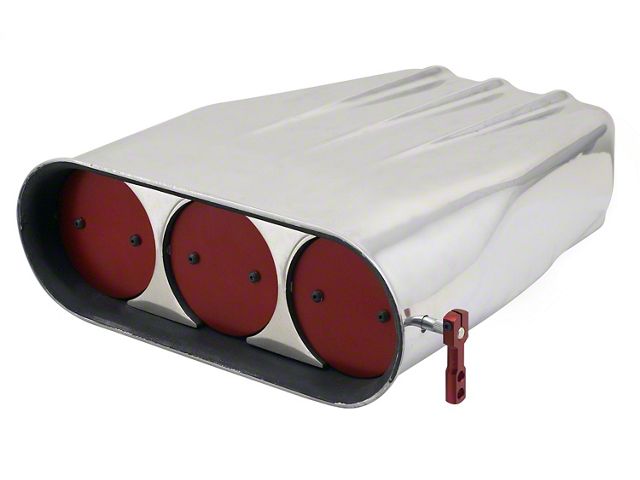 Here's the sequel to the original street scoop. A shorter version, only 14 1/2 inches long, a full 5 1/2 inches shorter than the original street scoop. Ideal for V6 and V8 engines. Like its predecessor, street scoop II is a precision cast-aluminum unit that is fully machined and polished to a high luster. It features three large diameter red anodized butterflies that operate off the carburetor linkage. Pn6658 is designed to fit single 4-bbl carburetors with a 5 1/8 inch diameter neck. Included is a low profile, 7/8 inch high stamped steel mounting plate and a 4 inch tall cast aluminum mounting flange for through-the-hood applications. Street scoop II's are complete with filter element, butterfly assembly and all necessary hardware. Street scoop II for 5 1/8 inch diameter carburetor neck.