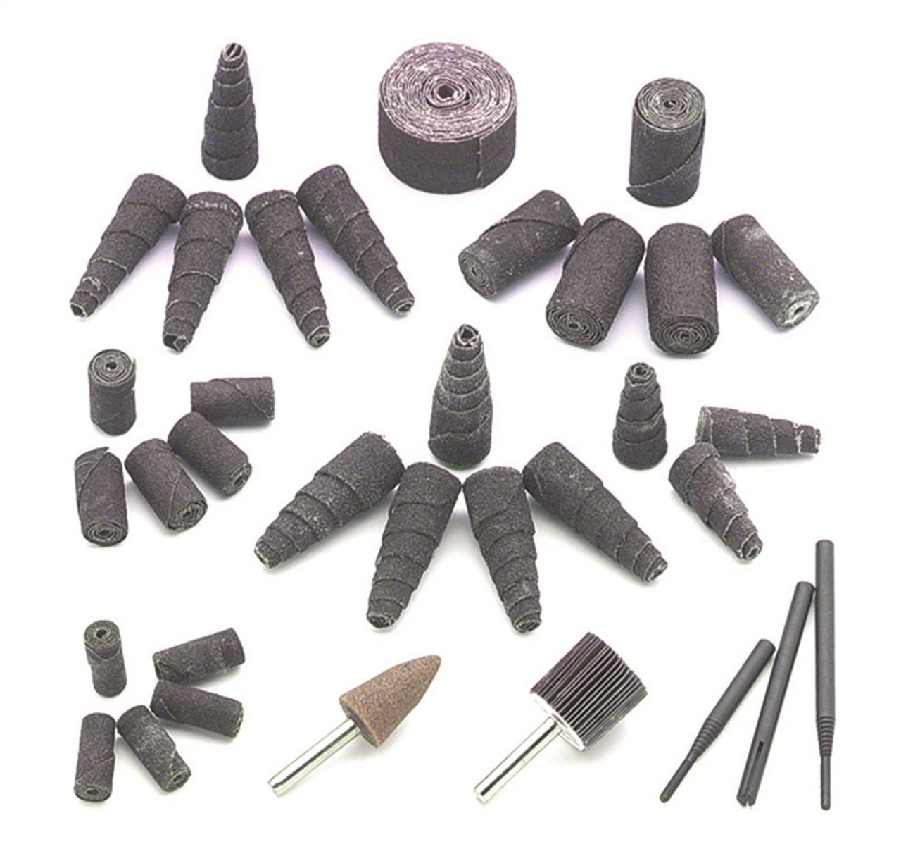 Mr. Gasket's Port Polishing Kit is designed for use on cast iron and aluminum components. This kit allows you to do your own detailed porting, polishing, and removal of flashing on all engine parts with the use of an electric drill. The kit contains 1 tapered cutting stone, 1, 1 inch diameter mini grind-flex flat wheel, 31 grind-polishing rolls (assorted sizes), and 3 various length mandrels.