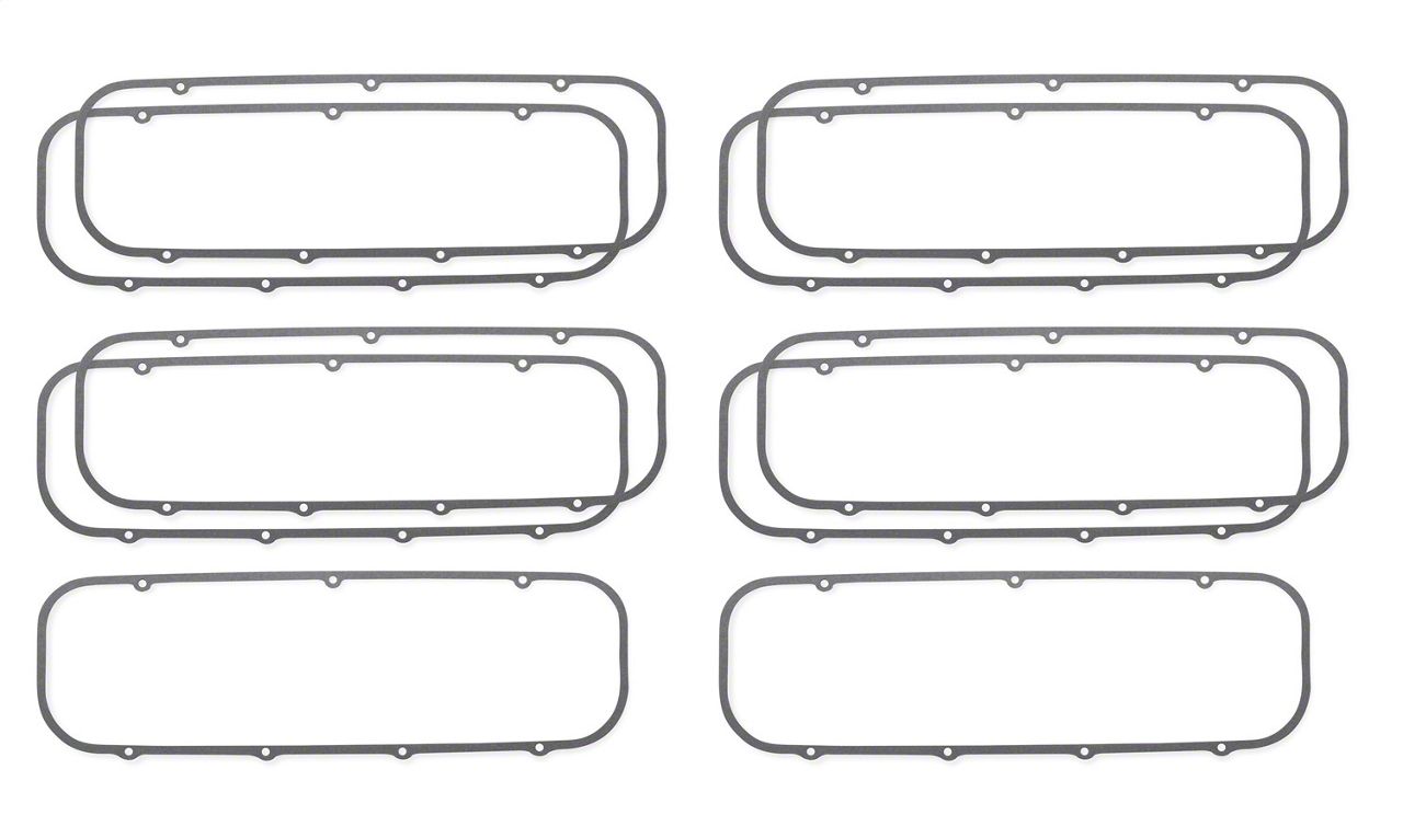 Thick, molded rubber with steel carrier. Manufactured from high-density cork and rubber blend gasket material. A black latex rubber coating is applied to outside of gasket to help seal minor flange irregularities and eliminate the possibility of oil leakage. Creates a positive seal by controlled swelling of the gasket material when exposed to hot engine oil. Available in standard or extra thick to provide additional valve train to cover clearance. For OE replacement, high performance street, drag race and oval track.