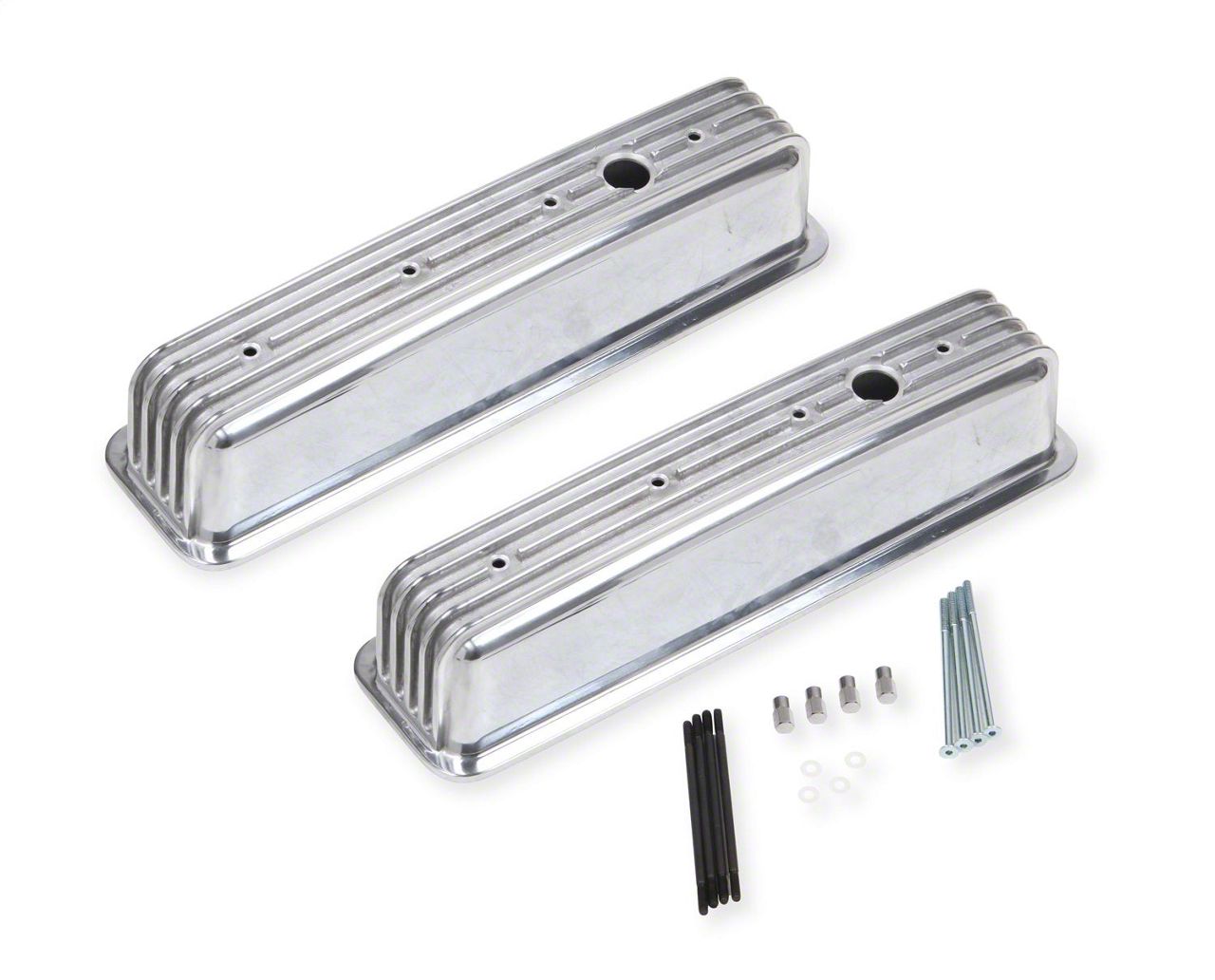 Mr. Gasket's aluminum valve covers are precision die cast for light weight and a perfect fit. Beautifully polished to a high luster, they are sure to enhance the appearance of any engine compartment. They feature an extended sealing lip to positively locate and secure the gasket and stop it from moving to eliminate oil leaks. Available with plain or ball-milled tops and include a 1 1/4 inch diameter breather hole, except where noted. Packaged two per set.