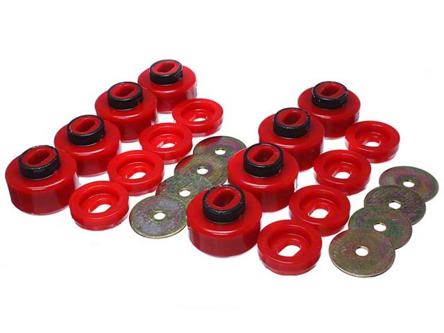 Will replace distorted and worn-out original rubber mounts to maintain car body and truck cab to bed alignment. Original rubber mounts are so soft they often crack, distort, and crush so badly they often fall off! And aluminum body mounts are too harsh for street use that they tend to break and cause other components to break. Energy's specially formulated Hyper-Flex polyurethane cab and body mounts combine the best qualities of both: they're soft enough for a smooth ride, yet rugged enough for the most demanding road or track. Most sets have a strong zinc plated steel ring molded into them - for added durability and when the application requires it.