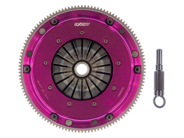 The EXEDY Hyper Single Series clutch is engineered to optimize the performance of cars that are moderately modified. Similar to our multi-plate clutches, it has a purple anodized, forged aluminum cover and maintains the pedal efforts at a reasonable level. Additionally, the pressure plate features a series of turbine-like vanes that keep the clutch cooler under extreme operating conditions. Hyper Single clutches come with a chromoly steel flywheel and a 6-puck cerametallic, sprung center damper disc assembly. However, on select vehicles, the new VF (Various Friction) disc may be offered. The chromoly flywheel is lighter than OEM for improved engine response. The disc is generally smaller and thinner than the OEM disc making for lower inertia and therefore quicker, easier shifting and less wear and tear on the transmission synchros. The higher clamp load and cerametallic friction facings give approximately twice the holding torque of the OEM clutch and higher than other single disc clutches. 6-Puck Cerametallic Disc: High friction coefficient, low wear, and a special heat resistant material T5001 has been applied to enable the clutch size to be reduced which in turn lowers mass inertia and improves shift responses for faster gear. Durability is improved with the use of a stronger, smaller damper disc, designed especially for the Hyper Single clutch. VF (Various Friction) Disc: The VF enables the driver to operate the clutch through an easy-to-feel half engagement thanks to the Ultra Fiber friction material all while having a high heat dissipation and torque capacity due to the integrated metal facing. Furthermore, pedal effort has been drastically reduced and improved by the re-engineering and re-designing of the engagement point with newly developed cushioning plates. All EXEDY Racing Hyper Single Series Clutch Kits carry SFI 1.1 Certification. Which means, when you buy these products, you can be confident they are certified for use in competitive motorsports.