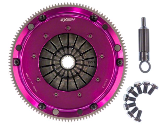 The EXEDY Hyper Single Series clutch is engineered to optimize the performance of cars that are moderately modified. Similar to our multi-plate clutches, it has a purple anodized, forged aluminum cover and maintains the pedal efforts at a reasonable level. Additionally, the pressure plate features a series of turbine-like vanes that keep the clutch cooler under extreme operating conditions. Hyper Single clutches come with a chromoly steel flywheel and a 6-puck cerametallic, sprung center damper disc assembly. However, on select vehicles, the new VF (Various Friction) disc may be offered. The chromoly flywheel is lighter than OEM for improved engine response. The disc is generally smaller and thinner than the OEM disc making for lower inertia and therefore quicker, easier shifting and less wear and tear on the transmission synchros. The higher clamp load and cerametallic friction facings give approximately twice the holding torque of the OEM clutch and higher than other single disc clutches.