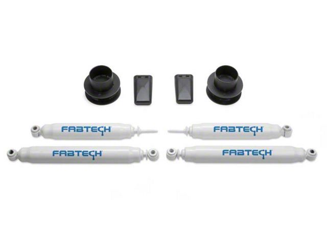 The 2.5in Lift system for 2014 3500 Rams, with factory Radius Arm front suspension, features more than just basic spacers. Dodge designed the front coil springs with a large bow to increase vehicle stability and handling. Unlike other flat spacers on the market, Fabtech's angled spacers retain this important feature preserving the factory ride characteristics. The front shocks are replaced with longer length Fabtech Performance twin tube shocks to allow for full suspension travel while improving the damping of the front suspension. Extended length bump stops are included in this kit to prevent the coil springs from binding at full compression while also eliminating Trac Bar interference. Optional rear shocks are available separately. This kit can be removed to return the vehicle to stock. Estimated installation time - 1.5 hrs. No drilling or welding required.