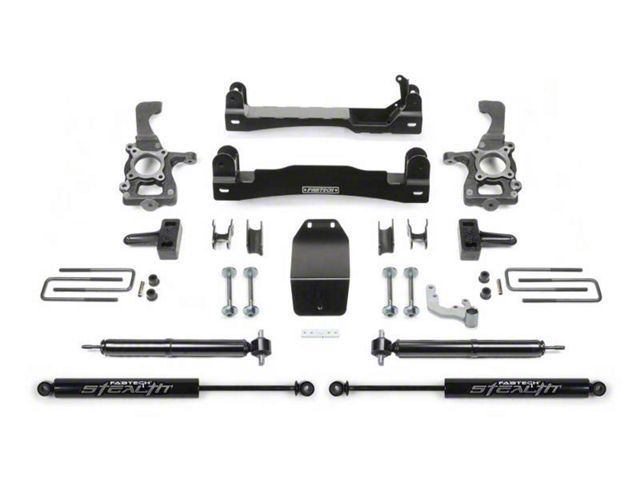 Fabtech's new 4'' F150 system utilizes their proven heavy duty construction and design features found in our 6'' systems but with less lift and at a much lower price. This 4'' Systems allows use of 35'' tall tires and features high arched lower control arm crossmembers constructed of 1/4 inch thick steel for maximum strength. The Fabtech ductile iron steering knuckles retain the stock track width keeping the tires under the fender for a clean appearance. Rear lift is accomplished with a block and u bolt configuration. The Basic System includes heavy duty front Coilover shocks for increased dampening capacity while retaining the factory coil springs. Rear shocks include Fabtech's Performance or Stealth shocks.