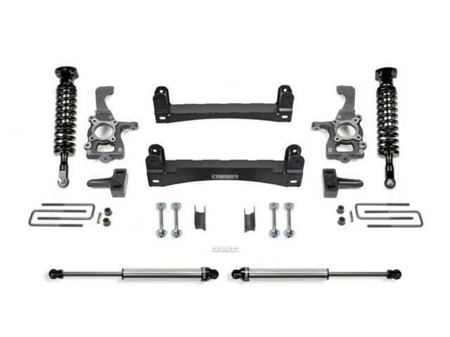 This system feature Fabtech's proven IFS technology with extended length ductile iron steering knuckles for proper Ford electronic stability control functionality. Heavy duty 1/4" thick steel lower control arm crossmembers provide superior ground clearance for adventurous offroad trails. Rear lift is accomplished with a 2.25" lift block and extended length u bolts. The Performance system includes Fabtech's legendary stainless steel Dirt Logic 2.5 Coilover shocks for outstanding damping capacity with a great highway ride. Rear shocks include the Dirt Logic 2.25. This high quality system does not require drilling or cutting for installation and comes Fabtech's 5/60 Powertrain warranty. 1/4" thick steel lower control arm crossmembers are arched for maximum ground clearance. Four adjustable alignment cams provide a wide range of adjustment. The fully welded box design of these crossmembers provides additional strength to the front suspension. Extended length ductile iron steering knuckles retain near stock track width keeping the tires under the fenders. These steering knuckles are designed to work in conjunction with the Ford ESC for proper functionality at all speeds. The Brake Line Brackets reposition the factory Ford brake lines down on the frame for the new travel range without having to open the brake system. Keeps factory fluid system intact. 1/4" thick steel drop brackets reposition the front sway bar for the increased ride height. This allows the sway bar link ends to fully cycle without binding throughout the extended travel range. 2.25" Tall rear lift blocks replace the factory blocks without changing the ride quality or load carrying capacity. American made U Bolts that retain the entire rear differential to the vehicle. A critical part that demands the best quality for your vehicle.