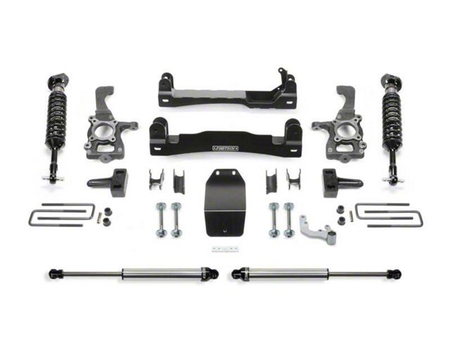 Fabtech's new 4'' F150 system utilizes their proven heavy duty construction and design features found in our 6'' systems but with less lift and at a much lower price. This 4'' Systems allows use of 35'' tall tires and features high arched lower control arm crossmembers constructed of 1/4 inch thick steel for maximum strength. The Fabtech ductile iron steering knuckles retain the stock track width keeping the tires under the fender for a clean appearance. Rear lift is accomplished with a block and u bolt configuration. The Performance System features Dirt Logic Stainless Steel 2.5 Coilover front shocks and Dirt Logic Stainless Steel 2.25 rear shocks for aggressive offroad capabilities with a smooth highway ride.