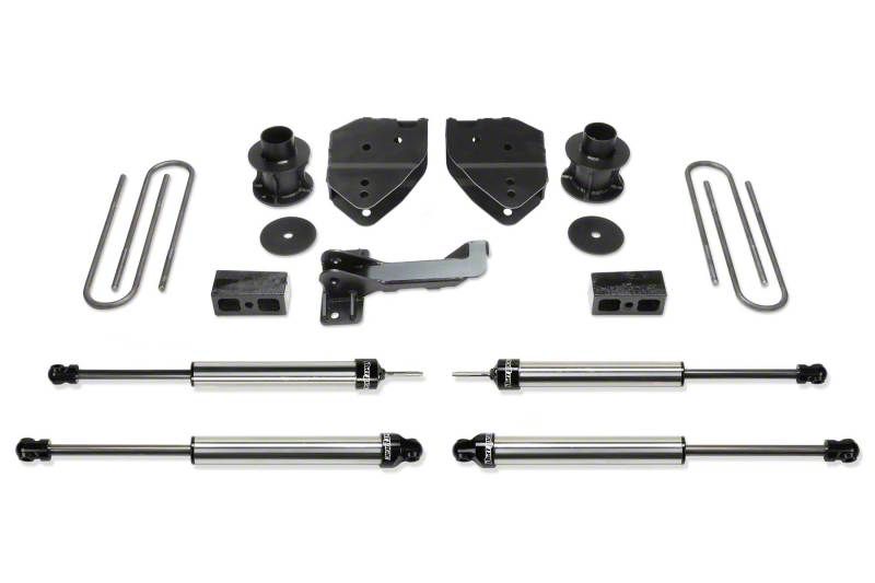 To enhance our extensive line of Super Duty suspension systems we have developed an entry level 4'' Budget System. The 4'' Budget System utilizes the factory front coil springs with a steel upper spacer providing 4'' of lift. Radius Arm drop brackets retain the factory arms with correct caster setting for the increase ride height. System includes a Trac Bar relocation bracket that has been designed to center the axle under the vehicle and still works properly with the factory Pitman Arm. This eliminates the need to replace the Pitman Arm resulting in a lower cost and faster installation time. Rear lift is accomplished with lift blocks and extended length u-bolts. This kit includes front and rear Dirt Logic shocks. System allows installation of 35'' tall tires with required inner fenderwell trimming for adequate tire clearance for street driving and light offroad use.