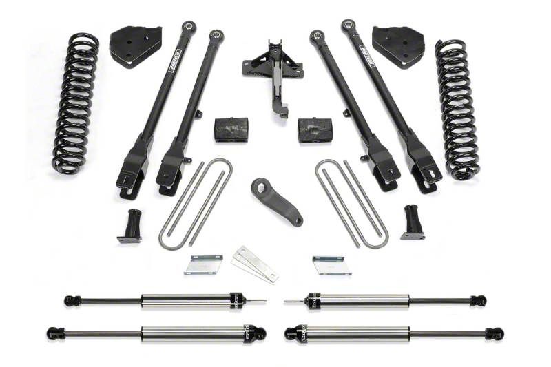 For the ultimate in suspension performance for the Super Duty we offer a bolt on 4 Link System that provides unsurpassed articulation and wheel travel. These 2'' diameter heavy wall links feature race style 1'' Uniballs for superior strength. Thick 1/4'' steel brackets secure the 4 Links to the frame without cutting or welding. This 4 Link system allows the use of our replacement Coil Springs. The system also includes Sway bar drops, Trac Bar relocation bracket, Pitman Arm, and a rear Block & U-Bolt kit. This kit includes front and rear Dirt Logic Shocks.