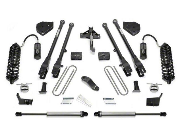Fabtech's 4in 4 Link Conversion System for the Ford F250/F350 is designed to provide maximum suspension performance for both on and offroad use. The system replaces the factory Radius Arm suspension with heavy duty 4 Link components for increased strength and functionality. The system will provide near zero caster change throughout the travel range which benefits on road driving. When offroad the 4 Link system will provide more articulation than a Radius Arm for increased terrain traversing at all speeds. The front suspension receives the finest shock upgrade on the market with the Dirt Logic 4.0 Coilover conversion. It will provide outstanding damping capacity offroad with a quality on road ride. This Coilover bolts in place of the factory coil spring without removal of the coil spring bucket. The Dirt Logic is constructed with a stainless steel body for maximum corrosion resistance. It comes with a giant 4in diameter aluminum remote reservoir that mounts horizontally above the Coilover to allow for full compression travel with oversized tires. The rear suspension receives a 5in lift block, extended bump stop brackets and Dirt Logic 2.25 shocks for a balanced ride quality. This 4 Link system with the Dirt Logic 4.0 Coilovers is the pinnacle of all Super Duty suspension systems for owners that demand the best. System includes a free 5 year 60,000 mile powertrain warranty. Each Fabtech component has been designed with specific features and benefits that create this quality suspension system. For a greater understanding of each these components, please see below.