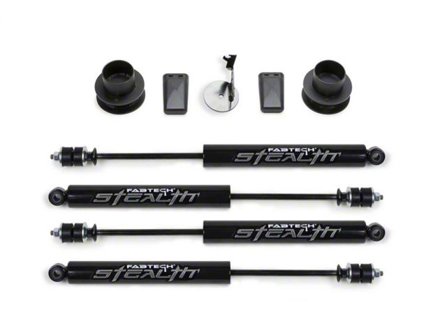 This 2.5" Ram lift kit has been designed to help level the vehicle while keeping the stock ride quality. It is perfect for Ram owners looking for a mild lift to clear 35" tall tires. The factory front Ram coil springs have a purpose built bow in them to aid in vehicle stabilization and handling. Fabtech's exclusive front coil spacers retain the factory coil seat angle and spring bow for stock like ride characteristics. The front shocks are replaced with longer length units to allow for full suspension travel while improving the damping of the Ram suspension. Extended length bump stops are included in this kit to prevent the coils from bind at full compression while eliminating Track Bar interference. The Stealth shocks in this Ram lift kit provide a great highway ride with good offroad damping capacity. This is a great 2.5" lift kit for Ram 2500 owners looking to level their truck and keep the stock ride. FEATURES: Angled Coil Spacers retain proper factory coil bow for handling. Replacement shocks allow for full travel with increased damping. Extended length bump stops eliminate coil bind and track bar interference. Comes with free 5 year 60,000 Mile Powertrain Warranty.