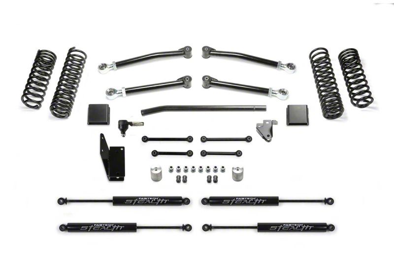 This Trail Lift Kit provides enhanced suspension performance to address all variants of off highway travel use including rock crawling, aggressive trail use and overland expeditions. This Gladiator lift kit has been tuned with proper dual rate coil springs and shock valving to provide a very compliant ride that you will appreciate. The system is a complete short arm suspension that utilizes the factory lower control arm mounts for an easy installation. The Fabtech lower link arms are constructed of thick wall steel tubing that are guaranteed never to bend. They come with large polyurethane bushings on one end with internal threads on the other to accept the groundbreaking Fabtech 5 Ton Joint for longevity and a quiet ride. Fabtech's dual rate Gladiator coil springs are corner specific to the Jeep JT. This keeps the vehicle level side to side and allows for increased suspension travel. The first stage of the spring provides a soft ride with the ability to extend for additional travel. The second stage is designed to handle the payload of the vehicle and address large impact absorption at higher speeds. To address the steering geometry with the increased ride height, a Draglink Flip kit along with a heavy duty Track Bar bracket is included. This relocates the Gladiator steering geometry to the factory plane allowing for full articulation without binding the draglink ends in extreme conditions. The rear Gladiator suspension receives a heavy duty Track Bar bracket to center the axle under the vehicle with the new ride height and help retain the factory roll center of the vehicle. Front and rear bumps stop extensions protect the Jeep Gladiator suspension from over cycling. This popular Jeep Gladiator lift kit is a top choice for daily drivers that enjoy tackling tough trails and overlanding with the comfort that they have a high quality complete suspension under their Gladiator. Each Fabtech component has been designed with specific features and benefits that cre
