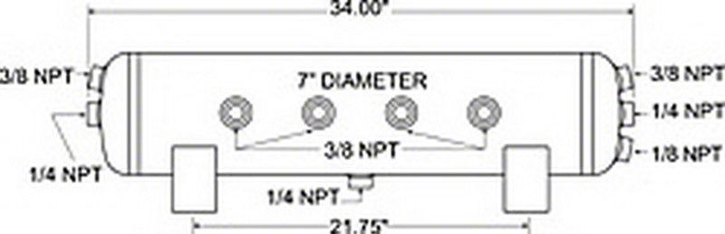 This Firestone air tank provides a source of compressed air for an air spring system. Tank has 5-gallon capacity, (6) 3/8 in. NPT ports, (3) 1/4 ports and (1) 1/8 port. Tank is enamel coated, tested to be SAE J10 compliant and capable of 150 psi.