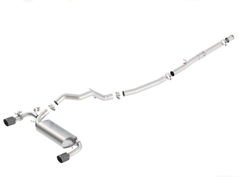 This system is equipped with a Sound Suppressing Valve simulator which ELIMINATES the valve. This avoids any warning lights on the dash while providing maximum flow at all times. System features Boryla's Polyphonic Harmonizer Technology which utilizes patented units that contain pipes of different diameters and lengths to create multiple exhaust notes that harmonize to deliver a clean, rich, full-bodied sound to the Borla mufflers. The mufflers then enhance this sound to the character and volume appropriate for our Touring, S-Type and ATAK(r) systems. System also features carbon fiber tips with black anodized centers. Borla Cat-Back & Axle-Back exhaust systems feature patented straight-through and multi-core technology to unleash hidden horsepower. Increased exhaust velocity adds power, driving excitement, fuel economy, and the distinctive Borla Sound of Power respected by motoring enthusiasts everywhere. Each system is built from premium T-304 austenitic stainless steel, superior to T-400 series knockoffs (such as 409), to give you the absolute best in performance and durability. Ultra-smooth mandrel bends ensure maximum flow & power, and precision computer-controlled CNC manufacturing ensures an accurate fit. Best of all, Borla stands behind every system with a Million-Mile Warranty. Just what you'd expect from the world's most experienced (and most winning) exhaust brand.