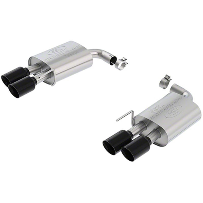 Features ultra-smooth mandrel bends, warp-free flanges and superior craftsmanship. 2.25 in. stainless steel mandrel bent tubing; 4 in. black chrome-plated stainless steel tips. Uses Stock hangers and mounts. Factory exhaust pipe must be cut to install clamp on Ford Performance axle back mufflers.
