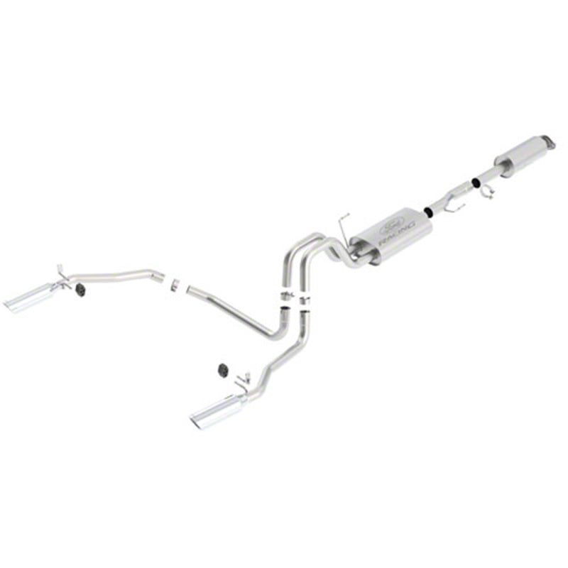 Do you want to make sure your Ford F-150 sounds as good as it looks? Now you can with this Ford Racing Sport Cat-Back Exhaust for all 2011, 2012, 2013 and 2014 F-150's with a 5.0L Engine and 145 in. Wheelbase. It is uniquely designed and tuned to provide optimum performance, a fiercely aggressive tone, tested durability and pure, high performance driving excitement! This exhaust is constructed from high-quality T-304 stainless steel and features ultra-smooth mandrel bends, warp-free flanges and an all out superior craftsmanship. Exiting the rear of the vehicle are dual, chrome plated 4 in. exhaust tips with 'Ford Racing' embossed on them. This Touring cat-back exhaust is 49-state legal for drive-by noise, so almost everyone can install this system in their F-150 with a 5.0L Engine and a 145 in. wheelbase and rip down the road or path!