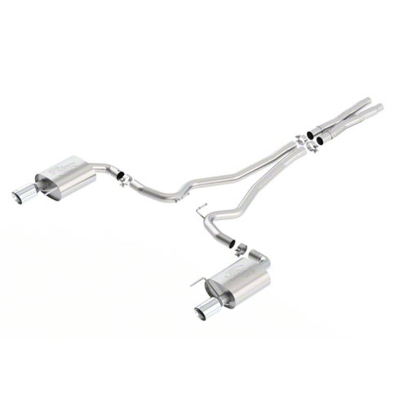 Ford Racing has partnered with industry leader Borla Exhaust to offer the first in a series of Ford Racing by Borla systems for the new 2015 Mustang. This cat-back system is constructed from ultra-smooth mandrel bent 300-series stainless steel tubing that is designed and fit to Ford Racing specs. This 2.5 in. cat-back exhaust system will give you an aggressive muscle car sound. This cat-back exhaust system with integral X-pipe bolts directly to the stock factory catalytic converters, making your Mustang 100% emission compliant. These tuned stainless steel mufflers with 4 in. chrome-plated stainless steel tips not only sound great but look great too.