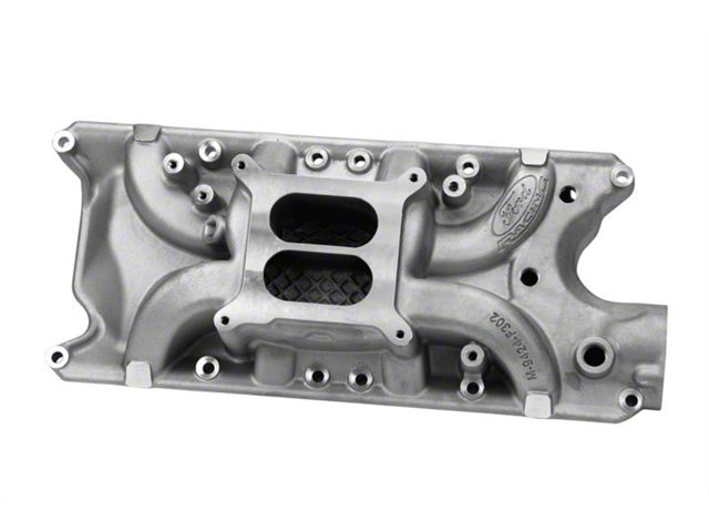 289/302 Dual-Plane Intake Manifold for use with 8.206- in. deck height block and inline valve heads. 4.375- inches at the front of the carburetor pad and 5.250- inches at the rear. 1500-6000 rpm range, dual plane intake and excellent fuel distribution. For use with any mid-rpm small block application, great for street cars and mild race engines. Does not fit Z or the GT-40 X heads.