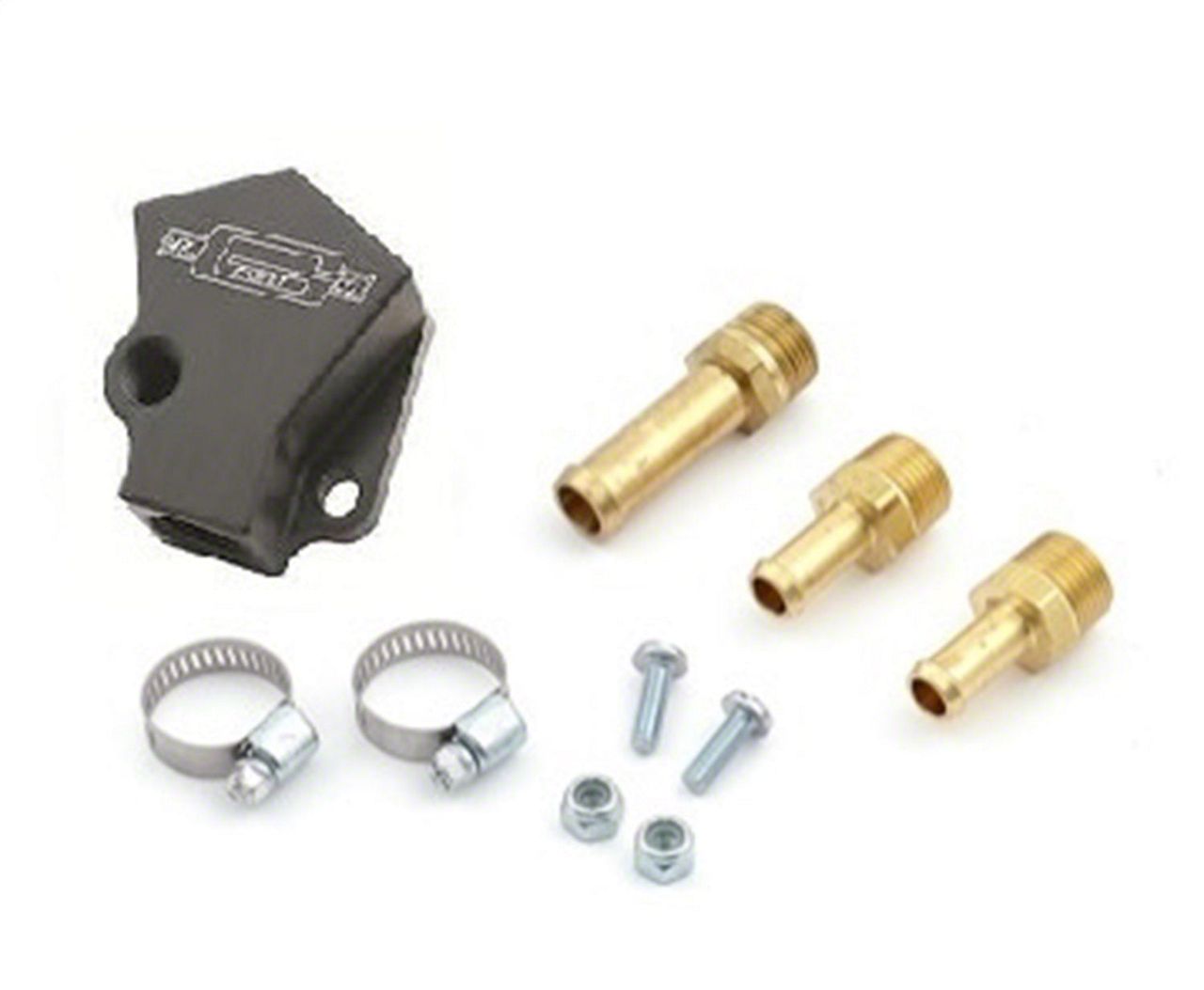 The Y fuel block kit allows equal flow for multiple carburetors applications. It is manufactured from top quality aluminum with a 1/8 inch pipe thread hole cast into each unit to allow the use of a fuel pressure gauge at the Y. Inlet and outlet openings are 3/8 inch NPT. Brass fuel line fittings, worm-drive clamps, and mounting screws are included.